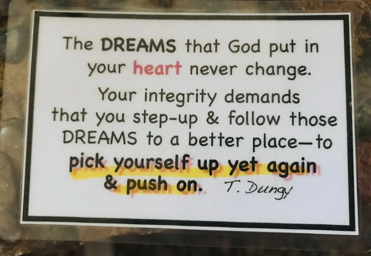 “Τα όνειρα που βάζει ο Θεός στην καρδιά σου δεν αλλάζουν ποτέ. H ακεραιότητα σου απαιτεί να κάνεις βήματα προς τα εμπρός, να ακολουθείς αυτά τα όνειρα, να φτάνεις σε μια καλύτερη θέση, να ξανασηκώνεσαι και να σπρώχνεις τον εαυτό σου”.