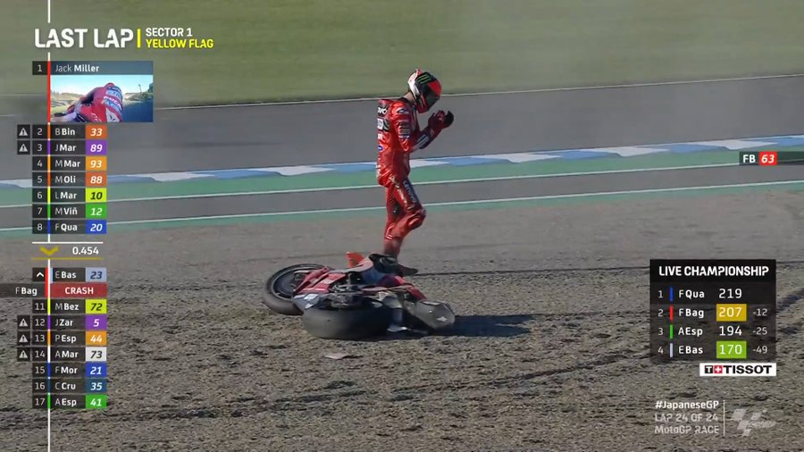Στον τελευταίο γύρο του αγώνα ο Πέκο Μπανάια προσπάθησε να περάσει τον Κουαρταραρό αλλά δεν απέφυγε το λάθος, «έχασε» το εμπρός μέρος της Ducati και βρέθηκε στην αμμοπαγίδα.