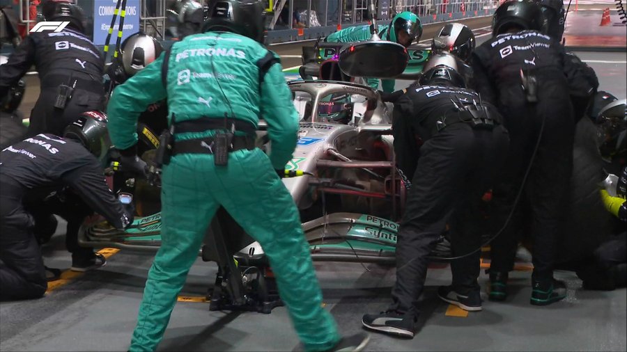 Αυτός ήταν ο Τζορτζ Ράσελ της Mercedes, ο οποίος μπήκε στα pit και άλλαξε τα ενδιάμεσα ελαστικά με ένα σετ μεσαίας γόμας των σλικ της Pirelli. Ήταν μια θαρραλέα επιλογή, που δεν έφερε όμως μεγάλα οφέλη καθώς η πίστα γλιστρούσε ακόμα πολύ και οι χρόνοι του όχι απλώς δεν έπεφταν, αλλά ήταν με διαφορά το πιο αργό μονοθέσιο στην πίστα. Η εγκατάλειψη του Αλόνσο, όμως, ελευθέρωσε τον Φερστάπεν, ο οποίος άρχισε αμέσως να γράφει γρήγορους γύρους και να πλησιάζει τον Νόρις που ήταν μπροστά του.