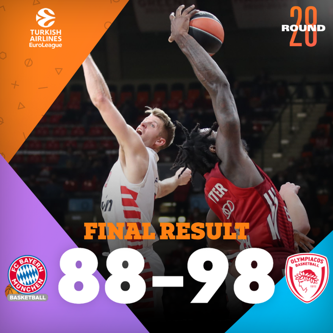 Ο Ολυμπιακός έφυγε πανηγυρίζοντας από το Μόναχο αφού επικράτησε της Μπάγερν με 88-98. Με αυτό το αποτέλεσμα η ομάδα του Γιώργου Μπαρτζώκα όχι μόνο εδραιώθηκε στις θέσεις των playoffs, αλλά έχει αυξημένες πιθανότητες να πάει σε αυτά με πλεονέκτημα έδρας.