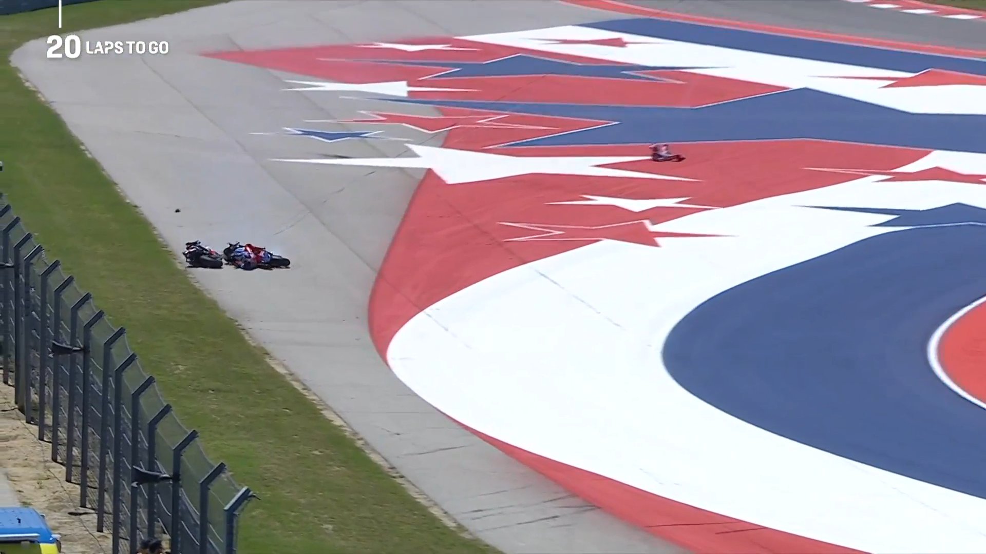 Ο Άλεξ Ρινς έδειχνε να έχει τεράστια αυτοπεποίθηση πάνω στη σέλα της LCR Honda και πίεζε διαρκώς τον Πέκο Μπανάια, οδηγώντας τον τελικά στο λάθος. Ο Ιταλός πρωταθλητής το παραέκανε στη 2η στροφή της πίστας, έχασε το εμπρός μέρος της Ducati του και ταυτόχρονα έχασε την ευκαιρία να κερδίσει, ή έστω να πάρει βαθμούς, στην Αμερική. Την ώρα που στη Honda έβλεπαν τις ελπίδες τους για νίκη να γιγαντώνονται, είδαν τον εργοστασιακό Τζοάν Μιρ να πέφτει κι αυτός και να εγκαταλείπει τον αγώνα.