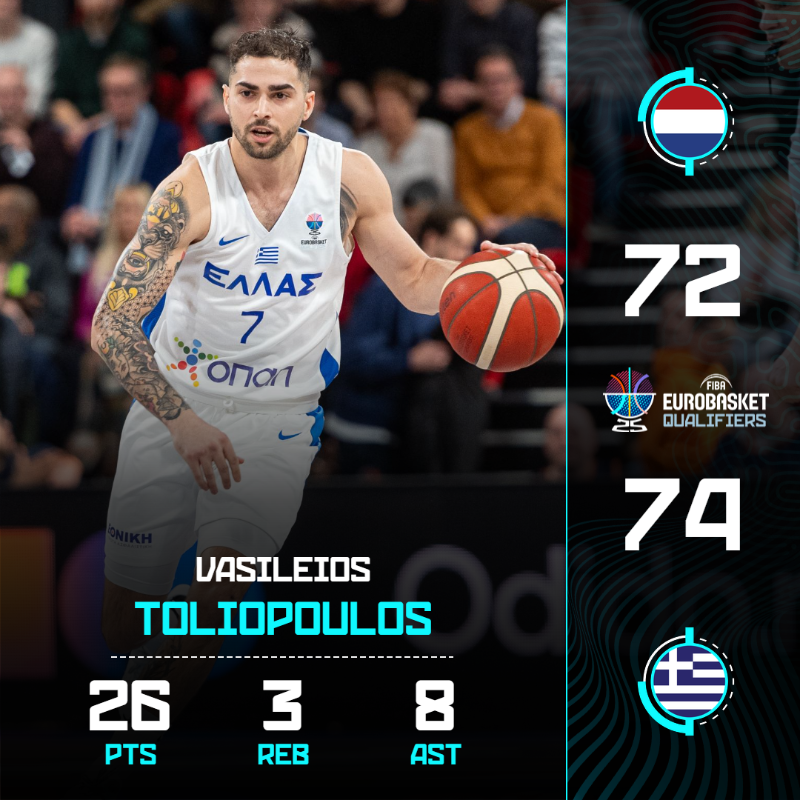 H Εθνική Ομάδα μετά από έναν συναρπαστικό σε εξέλιξη αγώνα νίκησε 74-72 την Ολλανδία στη Χάγη για να κάνει το 2/2 σε αυτό το πρώτο παράθυρο της προκριματικής φάσης του Ευρωμπάσκετ 2025 με τον Βασίλη Τολιόπουλο να σταματά στους 26 πόντους!