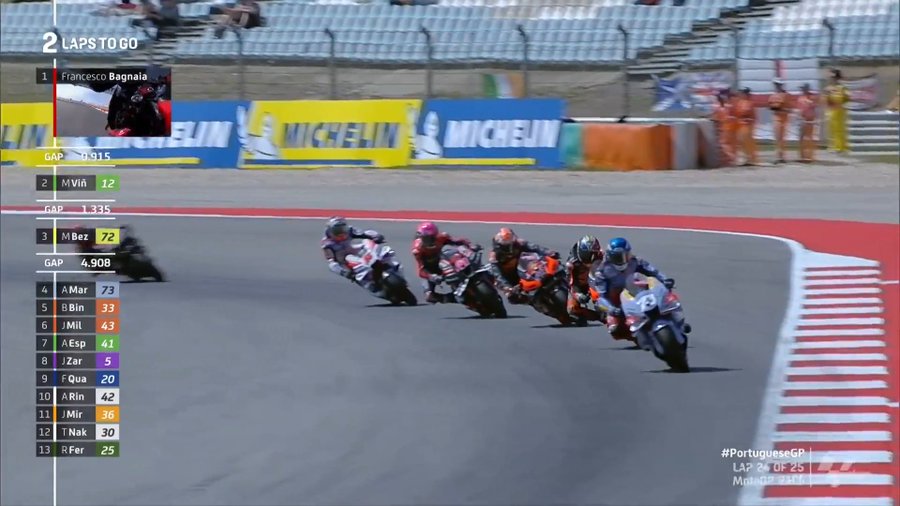 Με όλο αυτόν το χαμό που έγινε πίσω του, ο Πέκο Μπανάια είχε την ευκαιρία να αρχίσει να απομακρύνεται, αλλά δεν κατάφερε να την κεφαλαιοποιήσει γιατί ο ταχύτατος Μάβερικ Βινιάλες με την Aprilia βρέθηκε πίσω του και άρχισε να τον καταδιώκει με αξιώσεις.