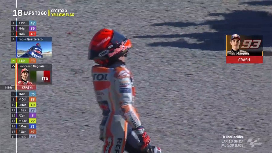 Ένα από τα εμπόδια στο δρόμο του Κουαρταραρό προς την κορυφή έφυγε μόνο του από μπροστά του, όταν ο Μαρκ Μάρκεθ είχε πτώση, λίγο πριν από το μέσον του αγώνα. Ο Γάλλος ήταν πλέον 4ος, αλλά ο Τζακ Μίλερ μπροστά του απείχε κάτι λιγότερο από 2 δευτερόλεπτα. Ο Κουαρταραρό είχε να εκτελέσει έναν ηράκλειο άθλο.