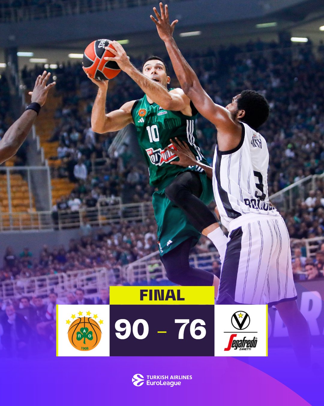 Η συνέχεια ωστόσο δεν ήταν ήταν ίδια. Ο Παναθηναϊκός δεν ξεκίνησε καλά το 4ο και τελευταίο δεκάλεπτο καθώς η Βίρτους 4-0 σερί και ενώ είχαν μεσολαβήσει άστοχες επιθέσεις των «πρασίνων» και μάλιστα σε ελεύθερα σουτ. Οι Ιταλοί βρέθηκαν στο +5 (62-67 στο 32′) και έδειχναν να ελέγχουν το παιχνίδι. Το «τριφύλλι» απάντησε με δικο του 13-0 (γκολ φάουλ Γκριγκόνις, λέι απ Μήτογλου, έξι σερί πόντοι του Λεσόρ, τζαμπ σουτ Σλούκα) για το «πράσινο» +8 (75-67) στο 36′.