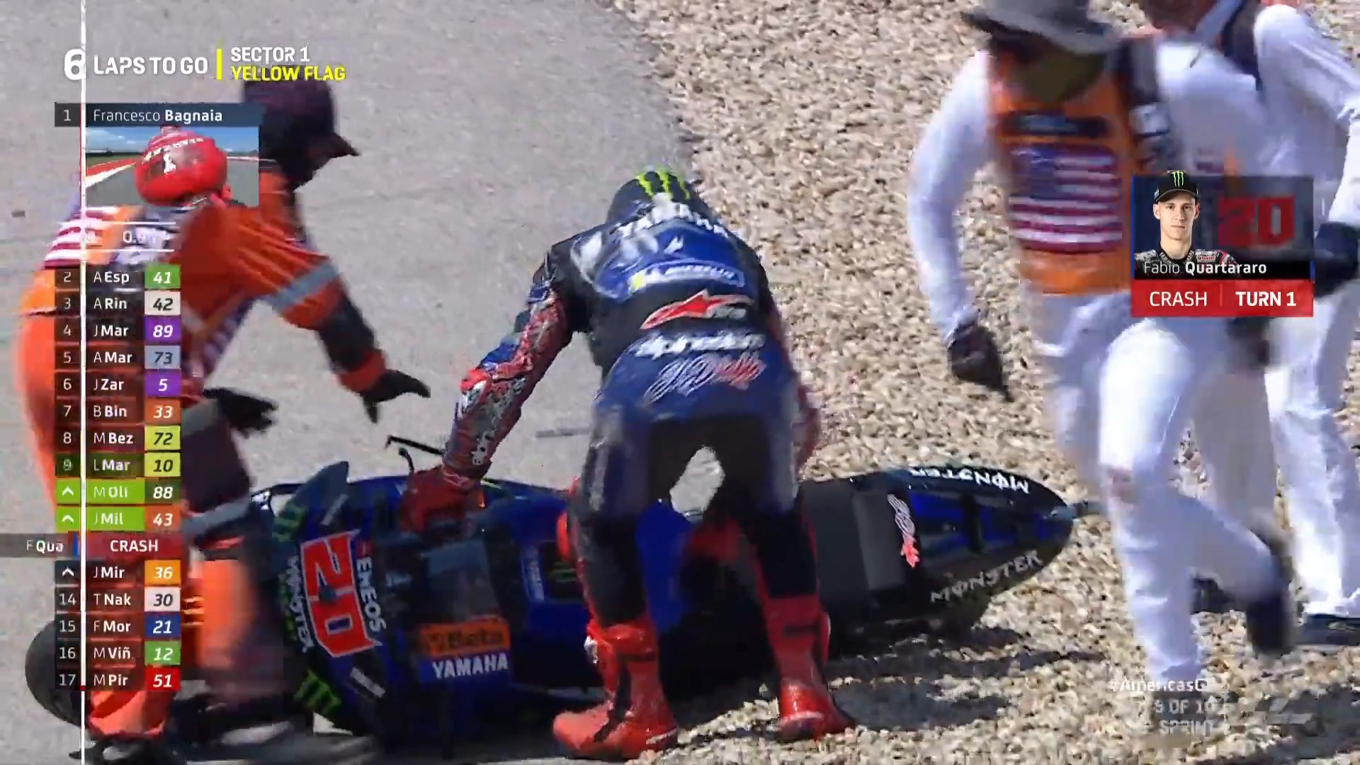 Το καλό ξεκίνημα του Κουαρταραρό δεν είχε ανάλογο συνέχεια καθώς σε μια πίστα όπως αυτή του Όστιν, όπου η ιπποδύναμη έχει τον πρώτο λόγο, η Yamaha του Γάλλου ήταν σχεδόν ανυπεράσπιστη μπροστά στις ταχύτερες Ducati. Ο Κουαρταραρό έχασε άλλη μία θέση από τον Άλεξ Μάρκεθ και λίγο αργότερα, πάνω στην υπερπροσπάθειά του να μείνει κοντά, είχε μια πτώση και ο αγώνας του έληξε άδοξα.