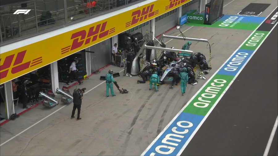 Λίγο αργότερα μπήκε και ο πρωτοπόρος Τζορτζ Ράσελ, όπως και ο Φερστάπεν από την 5η θέση. Στον επόμενο γύρο μπήκε και ο Κάρλος Σάινθ, που άλλαξε τα μεσαία ελαστικά με άλλο ένα σετ μεσαία. Δεν ήταν καλό pit stop και ο Ισπανός επέστρεψε στην πίστα πίσω από τους Ράσελ και Οκόν. Ο Λεκλέρ όμως δεν μπήκε στα pit, παρά αρκετούς γύρους αργότερα.